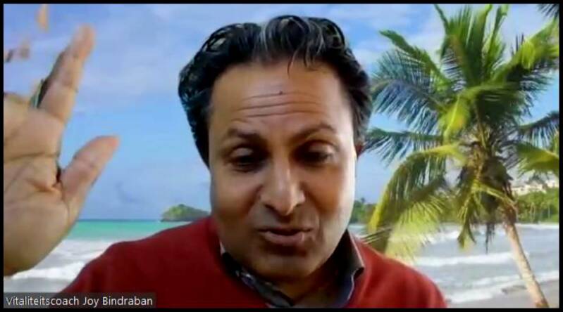 Presentatiemeester Joy Bindraban introduceert kort Eddie de Jong (arts) en de gast Roxanne van Olst